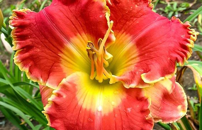 Лилейник Streetcar Named Desire (Стриткар Неймд Дизае). SEV. Тетраплоид. Цветок очень крупный (18 см), землянично-красный с солнечно-меловым водяным знаком. Горло зеленое. Кайма широкая, гофрированная, с золотой окантовкой. Срок цветения средний. Ароматный.