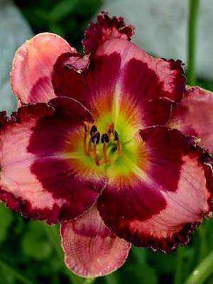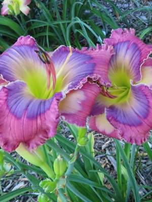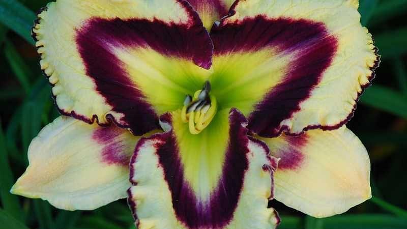 Лилейник Sulphurite Prism (Сульфурит Призм). DOR, TET. Цветок крупный (15 см), желтовато-кремовый с фиолетовым треугольным глазом. Горло зеленое, треугольное. По краю тонкая фиолетовая кромка. Высота цветоносов 64 см. Срок цветения средне-ранний.