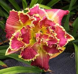 Розовый с зелёным горлом и жёлтой каймой, махровый, крупный, повторное цветение