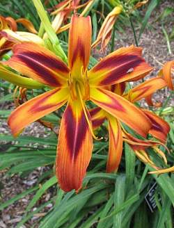 Лилейник Tiger Eye Spider (Тайгер Ай Спайдер). Цветок бронзово-оранжевый с черно-оранжевым глазком и горлом, меняющим цвет от золотистого до зеленого. Лепестки достаточно тонкие, отчего растение приобретает легкий ажурный вид. Высота многолетника 70-80 см. Диаметр цветка 15 см. Время цветения июль — август.
