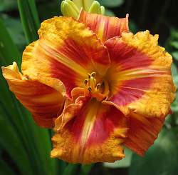 Лилейник Tiger (Тайгер). Вечнозеленый, тетраплоид. Очень крупный ароматный цветок яркой окраски. Основной цвет ярко-оранжевый, глаз вишнево-красный, горло желтое. Лепестки гофрированные. Осенью возможно повторное цветение. Очень неприхотлив, легко разрастается. Высокая морозостойкость.