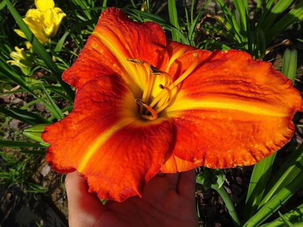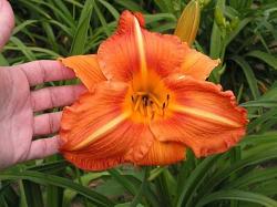 Лилейник Tuscawilla Tigress (Тускавилла Тайгрес). Зацветает в конце июля. Цветок огромный, ярко-оранжевый, горло жёлтое, светлая средняя линия. Темно-оранжевый глаз. Куст мощный. Тетраплоид, полувечнозелёный.