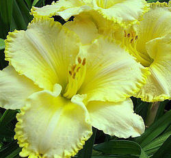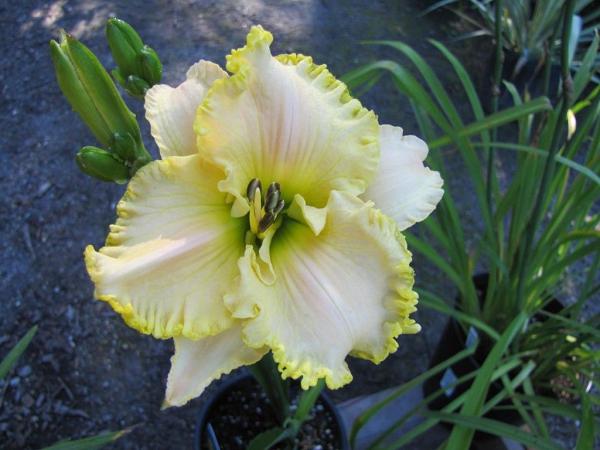 Лилейник Villa Vanilla (Вилла Ванилла). Цветок Желто-белый с желтыми центром и кантом по гофрированным краям лепестков. Диаметр цветка 12 см. Осенью возможно повторное цветение.