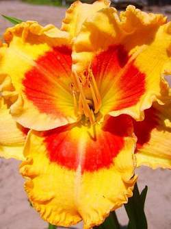 Лилейник X-Factor (Икс-фактор). Желтый с красным глазом и зеленым горлом. Шикарный гофрированный край. Диаметр цветков достигает 18 см и более. На 3-х-летнем растении до 200 цветков. Диплоид.