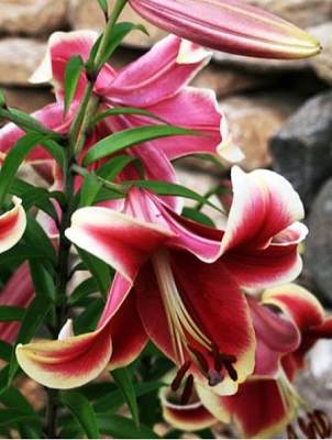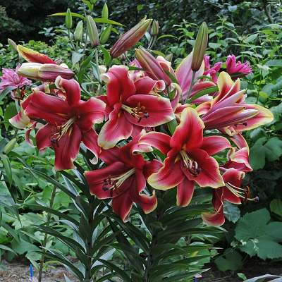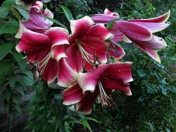 Лилии. Подходят для любого цветочного оформления участков. Низкорослые сорта и виды используют для посадок на бордюрах, высокие лилии используют для оформления дальнего плана и в солитерных посадках. Хороши они в группах, посаженные куртинами на газоне. Красиво смотрятся на фоне деревьев и кустарников и в сочетании со многими однолетниками и многолетниками. Некоторые низкорослые лилии можно применять для оформления каменистых участков.Используя при оформлении цветников лилии разного срока цветения, можно ими любоваться с июня до середины сентября.