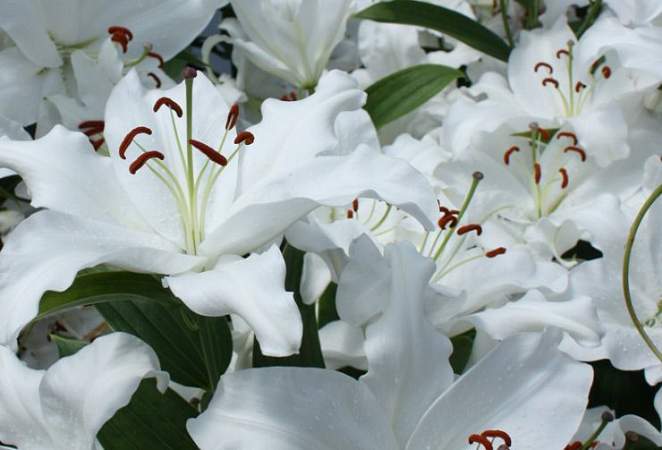 Лилия Alma Ata (Алма-Ата). Белоснежная красавица. Цветок 20 см в диаметре. Лепестки волнистые. Пыльники красиво выделяются (коричневые). Высота 100 см. Цветет букетами!