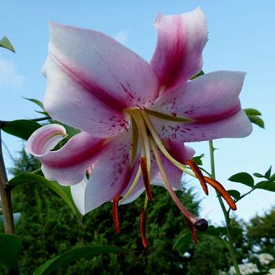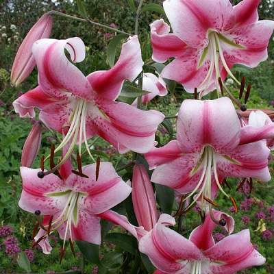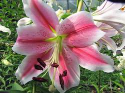 Лилия Anastacia (Анастасия). Гибридное растение с крупными 17-сантиметровыми цветками, махровые лепестки которых закручены и соединяют в своем окрасе насыщенный розовый цвет и белые края. При правильном уходе и благодатной почве стебель растения достигает около 110-130 сантиметров в высоту.