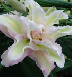 Лилия Annika (Анника). Густомахровая восточная лилия. Цветок крупный, белый, с зеленоватой полосой по центру лепестка и восхитительными розовыми тенями. Редкий крап. Высота от 90 до 120 см.