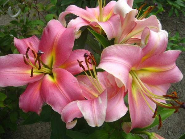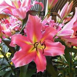 Лилия Aventino (Авентино). Цветки очень крупные (25 см в диаметре), розовые с желтой звездочкой в центре. Ароматные. Лепестки глянцевые. Высота 130 см.