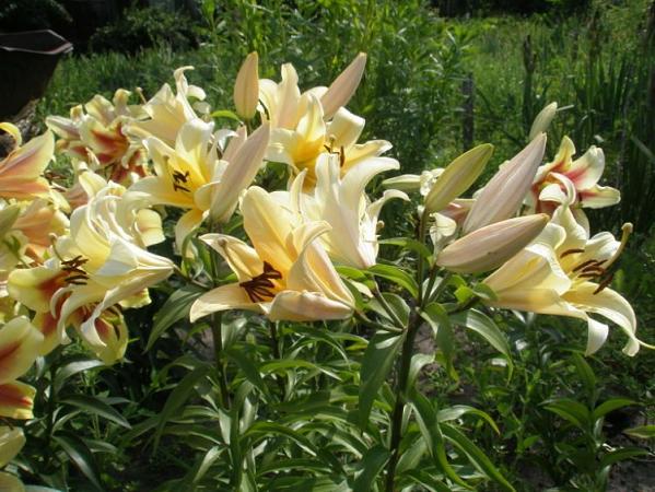 Лилии. Подходят для любого цветочного оформления участков. Низкорослые сорта и виды используют для посадок на бордюрах, высокие лилии используют для оформления дальнего плана и в солитерных посадках. Хороши они в группах, посаженные куртинами на газоне. Красиво смотрятся на фоне деревьев и кустарников и в сочетании со многими однолетниками и многолетниками. Некоторые низкорослые лилии можно применять для оформления каменистых участков.Используя при оформлении цветников лилии разного срока цветения, можно ими любоваться с июня до середины сентября.
