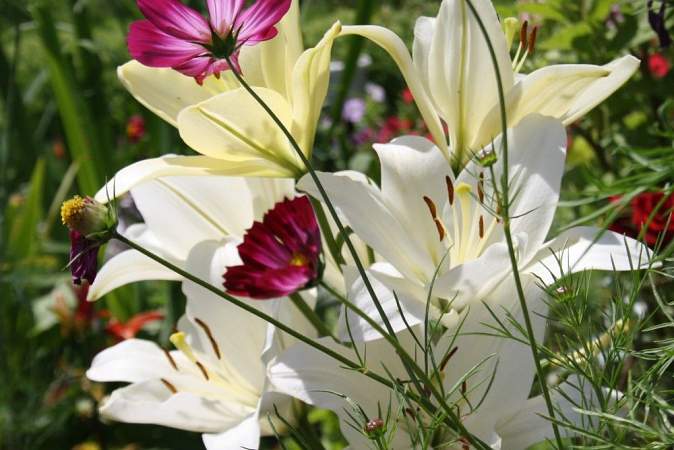 Лилии. Подходят для любого цветочного оформления участков. Низкорослые сорта и виды используют для посадок на бордюрах, высокие лилии используют для оформления дальнего плана и в солитерных посадках. Хороши они в группах, посаженные куртинами на газоне. Красиво смотрятся на фоне деревьев и кустарников и в сочетании со многими однолетниками и многолетниками. Некоторые низкорослые лилии можно применять для оформления каменистых участков.Используя при оформлении цветников лилии разного срока цветения, можно ими любоваться с июня до середины сентября.