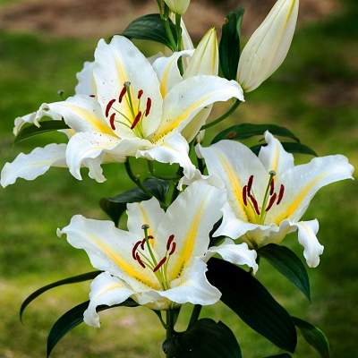 Восточные гибриды. Лилии поразительной красоты, их называют аристократами в мире лилий за экзотическую красоту необычайно привлекательных ароматных цветков. Цветки очень крупные, просто огромные, экзотических окрасок: бело-розовые, белые, малиновые, розовые с крапинками и полосками по центру волнистых лепестков или без них. Цветут в июле-сентябре. Необходимо солнечное место, хорошо защищенное от ветра, поскольку растения высокорослые с очень крупными цветками. Могут также расти в лёгкой тени деревьев. Главное правило — глубокая посадка, не менее 15 см, для защиты луковиц зимой.