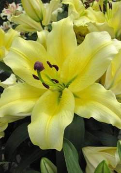 Лилия Baruta (Барута). Цветки диаметром 20 см, желтый с темно-желтой сердцевиной, направлены в сторону и вверх. Зацветает в июле-августе. Имеет сильный аромат. Высота растения 120 см.