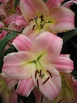 Лилия Baywatch (Бэйвотч). Цветки крупные, диаметром 25 см, ароматные, жемчужно-розовые с белым кантом и лимонно-желтым горлом. Высота 120 см.