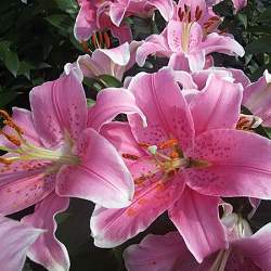 Восточные гибриды. Лилии поразительной красоты, их называют аристократами в мире лилий за экзотическую красоту необычайно привлекательных ароматных цветков. Цветки очень крупные, просто огромные, экзотических окрасок: бело-розовые, белые, малиновые, розовые с крапинками и полосками по центру волнистых лепестков или без них. Цветут в июле-сентябре. Необходимо солнечное место, хорошо защищенное от ветра, поскольку растения высокорослые с очень крупными цветками. Могут также расти в лёгкой тени деревьев. Главное правило — глубокая посадка, не менее 15 см, для защиты луковиц зимой.