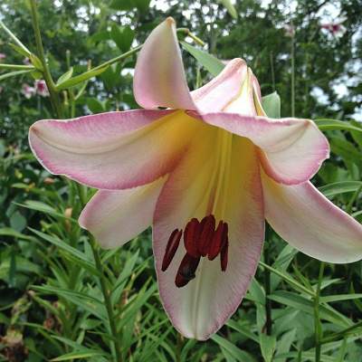 Лилия Beijing Moon (Бейджинг Мун). Крупная белая лилия с сиреневой каймой и жёлтым центром.