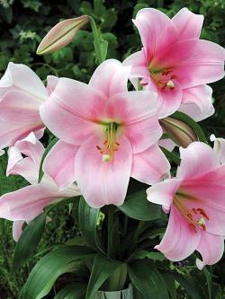 Лилия Bellsong (Беллсонг). Обладает крупными воронковидными цветками и отогнутыми лепестками околоцветника. Нежно-розовый, более светлый по краям цветок диаметром 25 см.