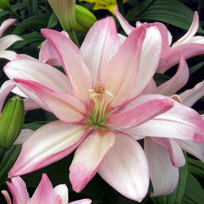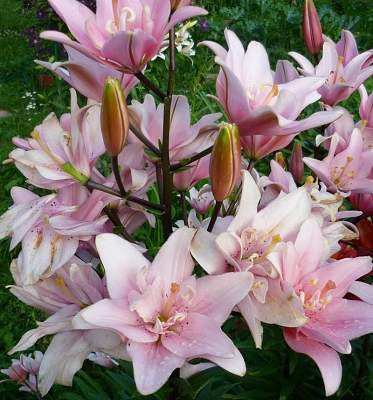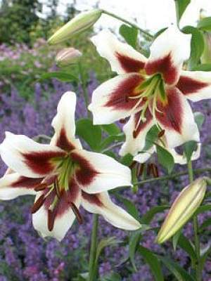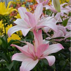 Лилия Bentley (Бентли). Роскошная лилия с кремово-розовыми махровыми цветками с розовым кантом и кончиками лепестков. Диаметр цветка 17 см, высота 100 см.