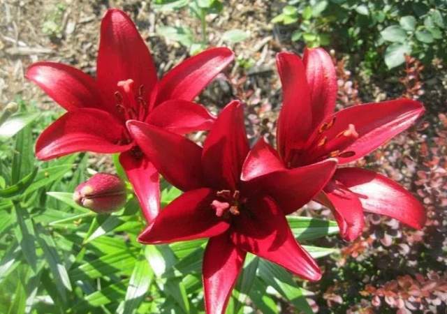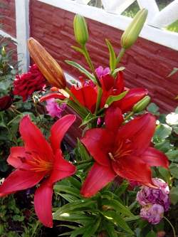 Лилии. Подходят для любого цветочного оформления участков. Низкорослые сорта и виды используют для посадок на бордюрах, высокие лилии используют для оформления дальнего плана и в солитерных посадках. Хороши они в группах, посаженные куртинами на газоне. Красиво смотрятся на фоне деревьев и кустарников и в сочетании со многими однолетниками и многолетниками. Некоторые низкорослые лилии можно применять для оформления каменистых участков.Используя при оформлении цветников лилии разного срока цветения, можно ими любоваться с июня до середины сентября.