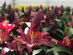 Лилия Bombastic (Бомбастик). Лилия имеет лепестки, окрашенные в насыщенно-винный оттенок, ярко-оранжевые пыльники эффектно выделяются на их фоне. Имеет сильный аромат. Высота растения 140 см. Предпочитает солнечные участки или полутень.