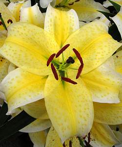 Лилия Breakdance (Брейкданс). Цветки крупные, диаметром 25 см, лимонно-желтые, с широкой белой каймой и коричневыми тычинками, чалмовидной формы, растущие вверх. Зацветает в конце июля-начале августа, имеет насыщенный аромат. Высота растения 130 см.