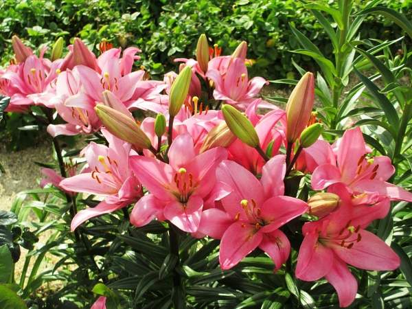 Лилии. Подходят для любого цветочного оформления участков. Низкорослые сорта и виды используют для посадок на бордюрах, высокие лилии используют для оформления дальнего плана и в солитерных посадках. Хороши они в группах, посаженные куртинами на газоне. Красиво смотрятся на фоне деревьев и кустарников и в сочетании со многими однолетниками и многолетниками. Некоторые низкорослые лилии можно применять для оформления каменистых участков.Используя при оформлении цветников лилии разного срока цветения, можно ими любоваться с июня до середины сентября.