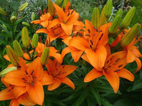 Лилии. Подходят для любого цветочного оформления участков. Низкорослые сорта и виды используют для посадок на бордюрах, высокие лилии используют для оформления дальнего плана и в солитерных посадках. Хороши они в группах, посаженные куртинами на газоне. Красиво смотрятся на фоне деревьев и кустарников и в сочетании со многими однолетниками и многолетниками. Некоторые низкорослые лилии можно применять для оформления каменистых участков.Используя при оформлении цветников лилии разного срока цветения, можно ими любоваться с июня до середины сентября.