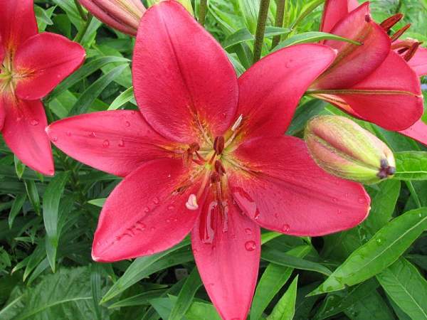 Лилии. Подходят для любого цветочного оформления участков. Низкорослые сорта и виды используют для посадок на бордюрах, высокие лилии используют для оформления дальнего плана и в солитерных посадках. Хороши они в группах, посаженные куртинами на газоне. Красиво смотрятся на фоне деревьев и кустарников и в сочетании со многими однолетниками и многолетниками. Некоторые низкорослые лилии можно применять для оформления каменистых участков.Используя при оформлении цветников лилии разного срока цветения, можно ими любоваться с июня до середины сентября.