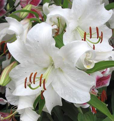 Восточные гибриды. Лилии поразительной красоты, их называют аристократами в мире лилий за экзотическую красоту необычайно привлекательных ароматных цветков. Цветки очень крупные, просто огромные, экзотических окрасок: бело-розовые, белые, малиновые, розовые с крапинками и полосками по центру волнистых лепестков или без них. Цветут в июле-сентябре. Необходимо солнечное место, хорошо защищенное от ветра, поскольку растения высокорослые с очень крупными цветками. Могут также расти в лёгкой тени деревьев. Главное правило — глубокая посадка, не менее 15 см, для защиты луковиц зимой.