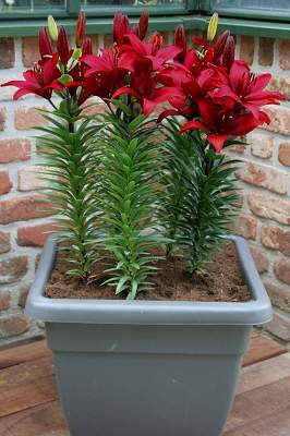Лилия Cavoli (Каволи). Невысокая лилия для выращивания в контейнере. На низком цветоносе крупные, очень яркие малиновые цветки с темным центром. Эффектная!