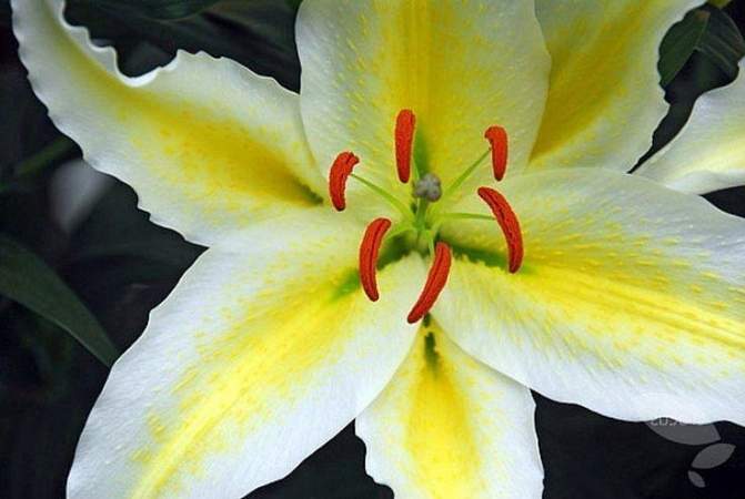 Лилия Chill Оut (Чил Аут). Элегантная ароматная белая лилия с широкой желтой полосой посередине лепестков. Диаметр цветка до 15 см. Цветок плоский, лепестки волнистые по краю, изящно загибаются назад. Пыльники оранжево-коричневые. Цветки направлены в стороны и вверх. Цветение июль-август. Высота растения 110 см, стебель прочный.