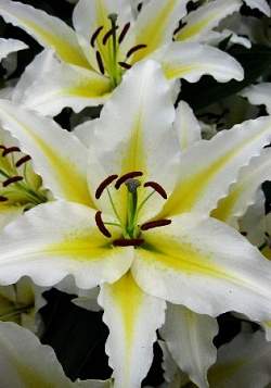 Восточные гибриды. Лилии поразительной красоты, их называют аристократами в мире лилий за экзотическую красоту необычайно привлекательных ароматных цветков. Цветки очень крупные, просто огромные, экзотических окрасок: бело-розовые, белые, малиновые, розовые с крапинками и полосками по центру волнистых лепестков или без них. Цветут в июле-сентябре. Необходимо солнечное место, хорошо защищенное от ветра, поскольку растения высокорослые с очень крупными цветками. Могут также расти в лёгкой тени деревьев. Главное правило — глубокая посадка, не менее 15 см, для защиты луковиц зимой.
