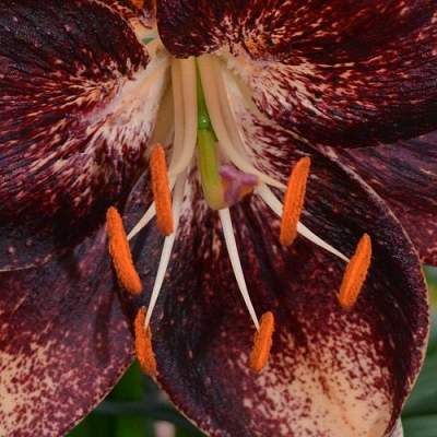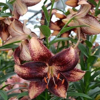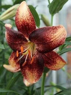 Лилия Chocolate Event (Чоклат Ивент). Цветок диаметром 18 см, светло-жёлтого цвета, с бордовым напылением. Бутоны смотрят в стороны. Высота взрослого растения до 100 см.