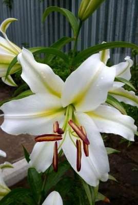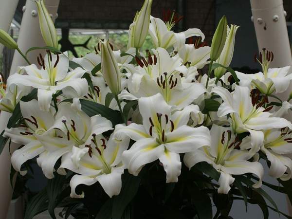 Лилия Cocossa (Кокосса). Высота растения 105 см. Цветок белый с жёлтыми лучиками от центра до одной трети лепестка.