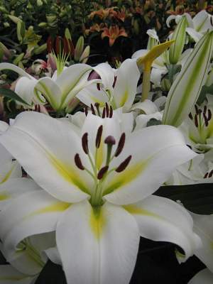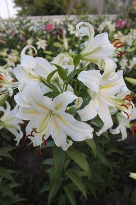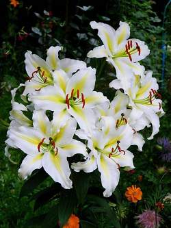Лилии. Подходят для любого цветочного оформления участков. Низкорослые сорта и виды используют для посадок на бордюрах, высокие лилии используют для оформления дальнего плана и в солитерных посадках. Хороши они в группах, посаженные куртинами на газоне. Красиво смотрятся на фоне деревьев и кустарников и в сочетании со многими однолетниками и многолетниками. Некоторые низкорослые лилии можно применять для оформления каменистых участков.Используя при оформлении цветников лилии разного срока цветения, можно ими любоваться с июня до середины сентября.