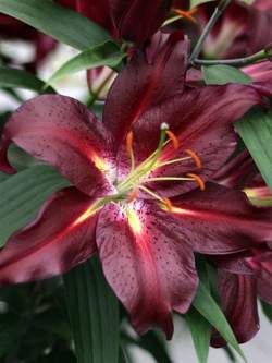 Лилия Commitment (Коммитмент). Шикарная лилия с крупными цветками (диаметром до 20 см!). Окраска темно-бордовая, с желтой "звездой" у основания, поверхность лепестков глянцевая, придающая цветкам неповторимый блеск при любом освещении. Цветки направлены вверх. Имеет насыщенный аромат. Высота растения 120 см.