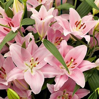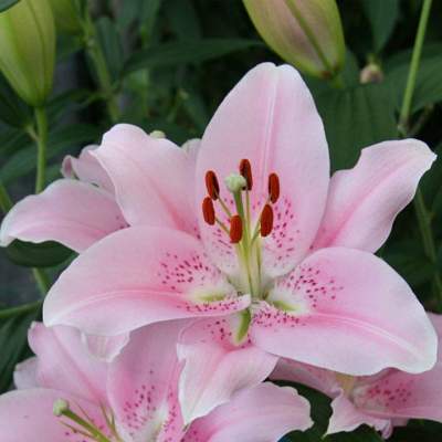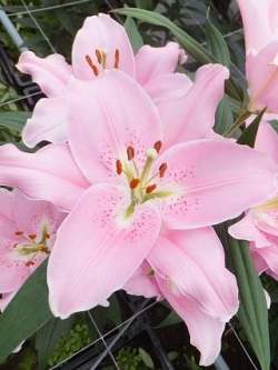 Лилия Companion (Компаньон). Цветки крупные, диаметром 20 см. Нежно-розового цвета, с мелким темно-розовым крапом у центра. Высота растения 120 см.