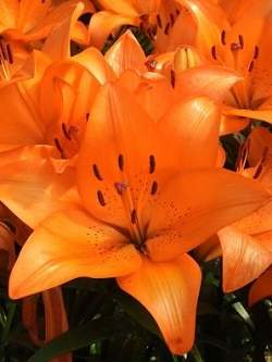 Лилия Corallo Beach (Коралло Бич). Крупный цветок, диаметром 20 см, насыщенный ярко-оранжевый. Высота 120 см.