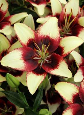 Лилия Curitiba (Куритиба). Кремовые кончики, винно-бордовый центр. Диаметр цветка 17 см, высота 60 см. Азиатские лилии предпочитают солнечное или полутенистое место, плодородную хорошо дренированную почву, хорошо зимуют в Подмосковье, цветут в середине лета 2-4 недели.
