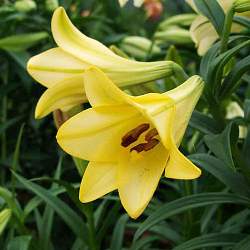 Лилия Deliana (Делиана). Цветки очень крупные, с загнутыми кончиками лепестков, достигают 15 см в длину, лимонно-желтые с коричневыми тычинками, растущие вверх и в бок. Зацветает в июле — августе, имеет тонкий нежный аромат.