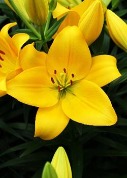 Лилии. Подходят для любого цветочного оформления участков. Низкорослые сорта и виды используют для посадок на бордюрах, высокие лилии используют для оформления дальнего плана и в солитерных посадках. Хороши они в группах, посаженные куртинами на газоне. Красиво смотрятся на фоне деревьев и кустарников и в сочетании со многими однолетниками и многолетниками. Некоторые низкорослые лилии можно применять для оформления каменистых участков.Используя при оформлении цветников лилии разного срока цветения, можно ими любоваться с июня до середины сентября.