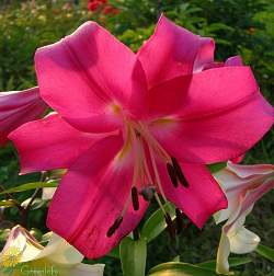 Лилия Donato (Донато). Густо-розово-лиловая. Внутренние лепестки умеренно-пурпурно-красные, поля сильно пурпурные. Горло желтовато-белого цвета. Крап отсутствует. Диаметр цветка 17 см.