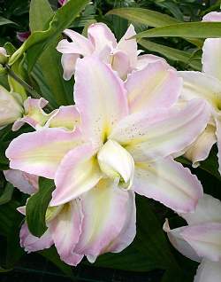 Лилия Double Ismael (Дабл Измаил). Восточная. Цветок белый с нежно-розовым краем и желтоватой полосой по центру, махровый, очень крупный.