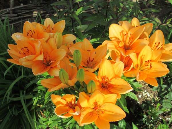 Лилии. Подходят для любого цветочного оформления участков. Низкорослые сорта и виды используют для посадок на бордюрах, высокие лилии используют для оформления дальнего плана и в солитерных посадках. Хороши они в группах, посаженные куртинами на газоне. Красиво смотрятся на фоне деревьев и кустарников и в сочетании со многими однолетниками и многолетниками. Некоторые низкорослые лилии можно применять для оформления каменистых участков.Используя при оформлении цветников лилии разного срока цветения, можно ими любоваться с июня до середины сентября.