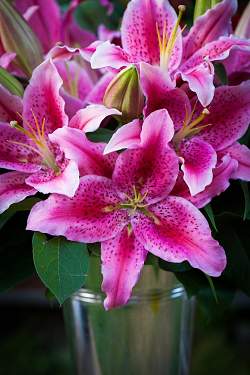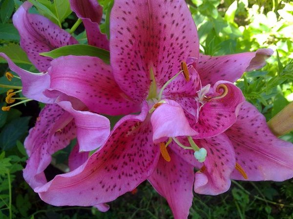 Лилия Dynamite (Динамит). Цветок темно-розовый с переходом к пурпурному. Лепестки волнистые, покрыты изящным коричневым крапом. Высота 80 см.