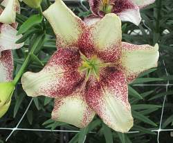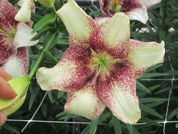 Лилия Easy Spot (Изи Спот). Цветок крупный, лепестки белые с зеленоватым оттенком и бордовым крапом. Без пыльцы. Высота около 100 см. Цветки 17 см в диаметре.