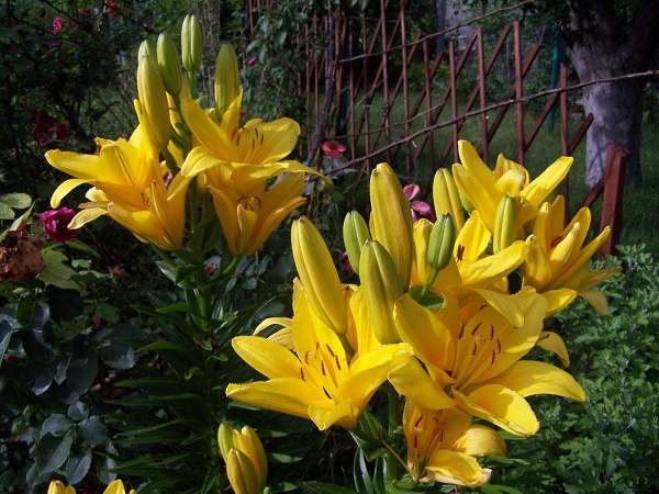 Лилии. Подходят для любого цветочного оформления участков. Низкорослые сорта и виды используют для посадок на бордюрах, высокие лилии используют для оформления дальнего плана и в солитерных посадках. Хороши они в группах, посаженные куртинами на газоне. Красиво смотрятся на фоне деревьев и кустарников и в сочетании со многими однолетниками и многолетниками. Некоторые низкорослые лилии можно применять для оформления каменистых участков.Используя при оформлении цветников лилии разного срока цветения, можно ими любоваться с июня до середины сентября.