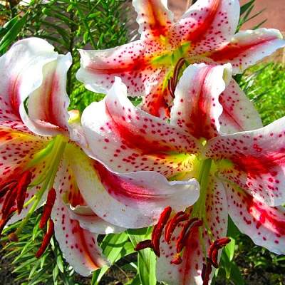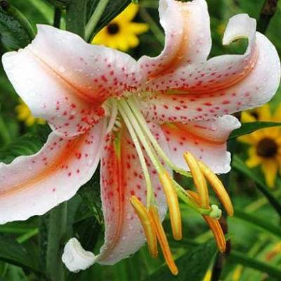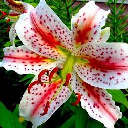 Восточные гибриды. Лилии поразительной красоты, их называют аристократами в мире лилий за экзотическую красоту необычайно привлекательных ароматных цветков. Цветки очень крупные, просто огромные, экзотических окрасок: бело-розовые, белые, малиновые, розовые с крапинками и полосками по центру волнистых лепестков или без них. Цветут в июле-сентябре. Необходимо солнечное место, хорошо защищенное от ветра, поскольку растения высокорослые с очень крупными цветками. Могут также расти в лёгкой тени деревьев. Главное правило — глубокая посадка, не менее 15 см, для защиты луковиц зимой.