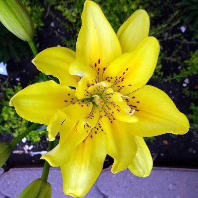 Лилия Fata Morgana (Фата Моргана). Цветок жёлтый, тёмно-красный крап на 1/3 длины каждого лепестка, диаметром 16,5 см, махровый.