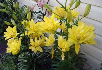 Лилии. Подходят для любого цветочного оформления участков. Низкорослые сорта и виды используют для посадок на бордюрах, высокие лилии используют для оформления дальнего плана и в солитерных посадках. Хороши они в группах, посаженные куртинами на газоне. Красиво смотрятся на фоне деревьев и кустарников и в сочетании со многими однолетниками и многолетниками. Некоторые низкорослые лилии можно применять для оформления каменистых участков.Используя при оформлении цветников лилии разного срока цветения, можно ими любоваться с июня до середины сентября.